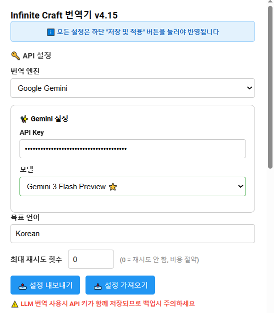 게임의 특성상 LLM의 능력보다는 속도가 더 중요하므로 가볍고 빠른 모델을 사용하시길 권장합니다. (gemini의 flash 시리즈, gpt의 mini 시리즈 등) 여러 모델을 사용하시는 분들을 위해 설정 내보내기/가져오기 옵션을 준비해두었습니다. 이때 API가 백업파일에 그대로 노출되므로 관리에 주의해주세요.